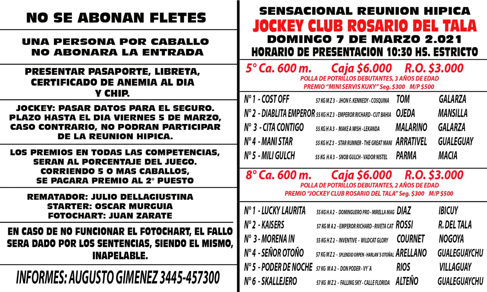 Programa de carreras; Rosario del Tala (E.R) - Domingo 7 de marzo 2021